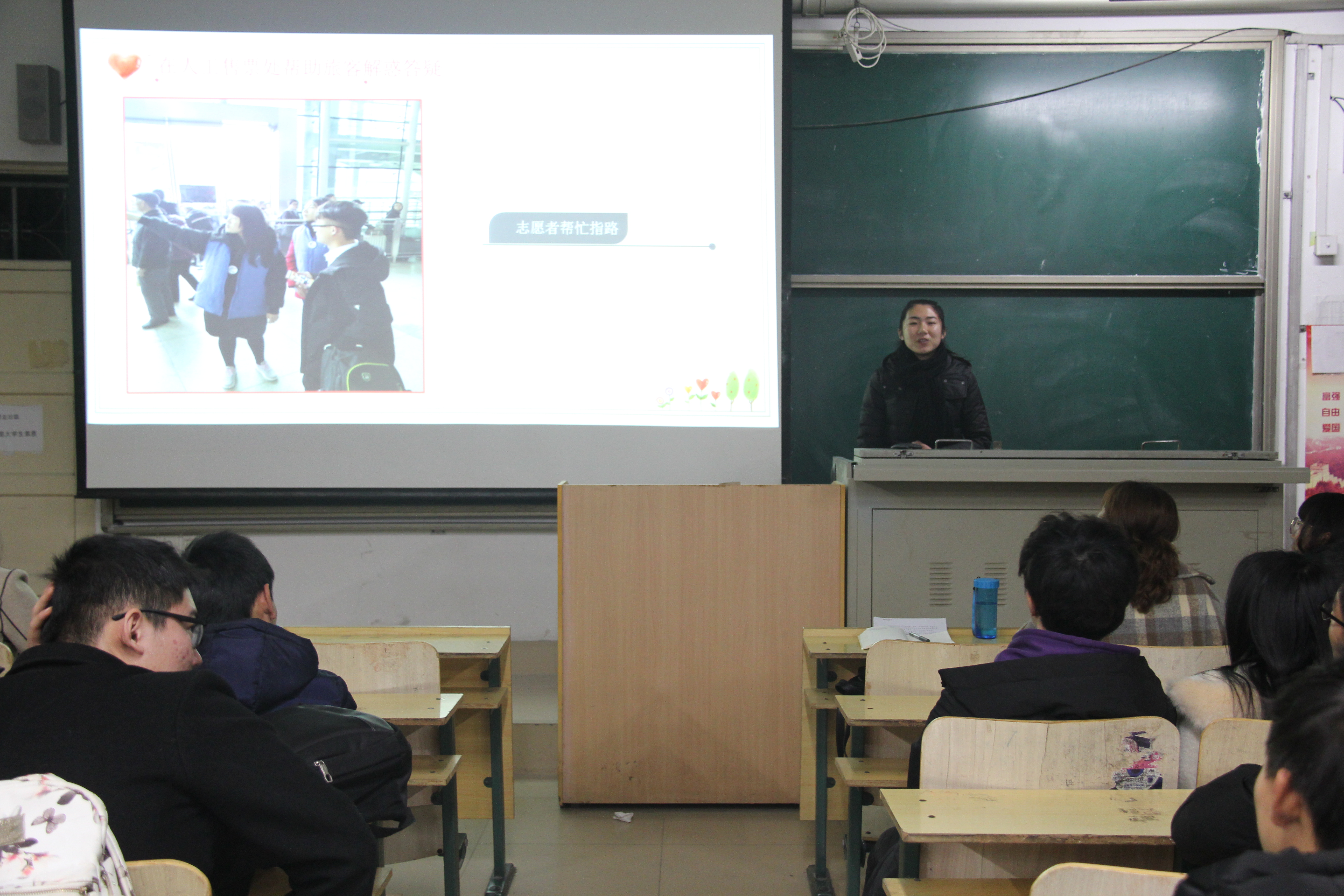 会议的主要目的是让同学们明白社会实践的意义以及社会实践所带来的收获。在会上,依次用PPT和视频展示了寒假实践活动情况,讲述了自己在社会实践中的经历以及自身感受。各班同学参与社会实践的方式各不相同,有的班级在火车站冒雨为乘客提行李、指路、买票,体会服务人员工作中的酸甜苦辣;有的班级在广场进行禁毒防艾的活动,召集市民签字来了解更多知识;还有的专门去了中国石油大学采访同学关于用水问题并参观实验室进行学习;还有的采集弘德湖的水来进行水质检测,呼吁大家不要往水里扔垃圾。不管是参与何种活动,同学们都切身体会到生活的来之不易以及实践的重要性。