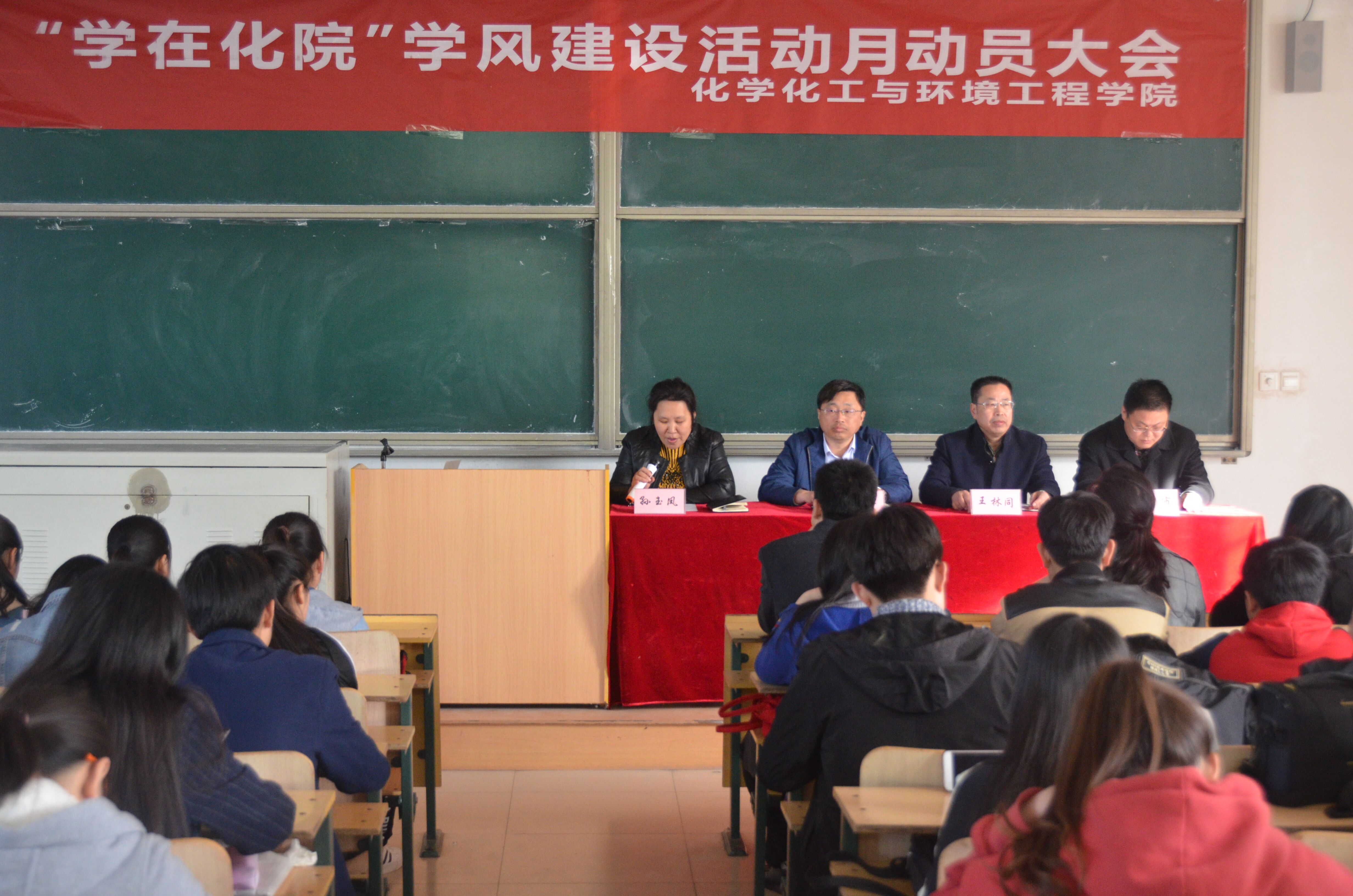 为加强学风建设,调动同学们的学习积极性和主动性,努力打造“学在化院”的学风品牌,4月8日下午,化学化工与环境工程学院在人合楼8212教室召开了“学在化院”学风建设活动月动员大会。化院党总支书记张华、院长王林同、副院长台夕市出席了本次动员大会,部分教师代表以及全体学生干部、宿舍舍长和部分学生代表200余人参加了本次会议。党总支副书记孙玉凤主持了会议。