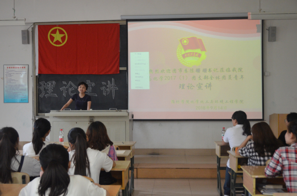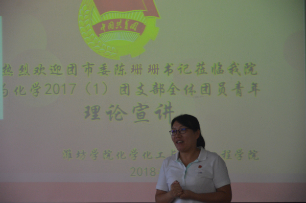 9月14日下午,共青团潍坊市委副书记陈珊珊莅临我校化学化工与环境工程学院,在人合楼8209教室为化学2017级1班团支部全体团员青年进行了理论宣讲。学校团委书记张晓静出席并主持了此次宣讲活动,学校团委组织宣传部副部长王辰羽、化学化工与环境工程学院团总支副书记马永生及化学化工与环境工程学院学生会主席马超与化学2017(1)团支部全体团员青年一起认真倾听陈书记的宣讲。
