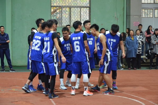 比赛一开始,气氛就有些许紧张,生物率先抢到跳球机会,获得主动权,并连连进球得分,打出了一波9:0的小高潮。化院请求暂停,及时商讨并改变战略技术,随后双方都展现出超强实力,你追我赶,不断进球得分,比分一度僵持不下,第二节下来比分为23:22。最后一节,比赛进入白热化阶段,两队比分胶着上升,每一次的进球都决定着最终的胜败,最终两队打平进入加时赛。此时场内外热血沸腾,加油呐喊声震耳欲聋,青春热情的豪放在球场上淋表现得漓尽致,到处洋溢着赛场的紧张气息。加时赛在落后6分的情况下,化院男儿不言弃,团队配合更加默契,队长唐晓骥担当了主要得分手,进攻和运球行如流水,接连几次空投全中,最终化院以63:60逆转,夺取了比赛的胜利,斩获本届篮球赛季军,为全校带来了一场精彩的视听盛宴。