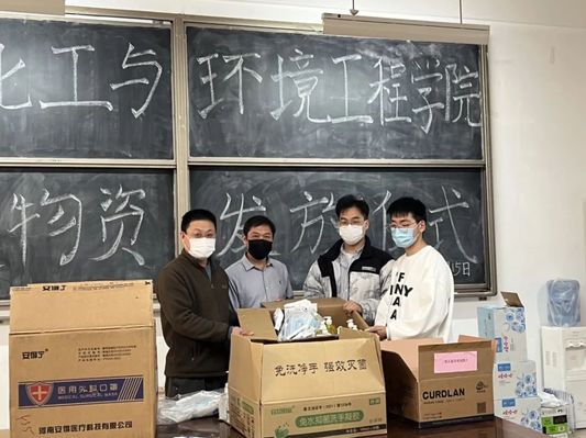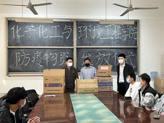 3月11日潍坊市出现新冠肺炎本土确诊病例,面对骤然严峻的疫情防控形势,学校学院迅速反应,在3月11日完成第一轮全员核酸检测后又在3月14日和15日两天完成了第二轮全员核酸检测。化学化工与环境工程学院严格落实疫情防控各项措施,在线上教学、毕业生考研复试指导、心理关注、核酸检测组织等工作中调用学院全部人力物力一切以学生为本,关爱关心学生。3月15日,经学院领导多方联系,与学院关系密切的友好企业山东尚科环境工程有限公司为我院捐赠了近300瓶洗手液、6000多只防护口罩、3箱二氧化氯泡腾消毒片、20余套防疫服以及一些生活物资。