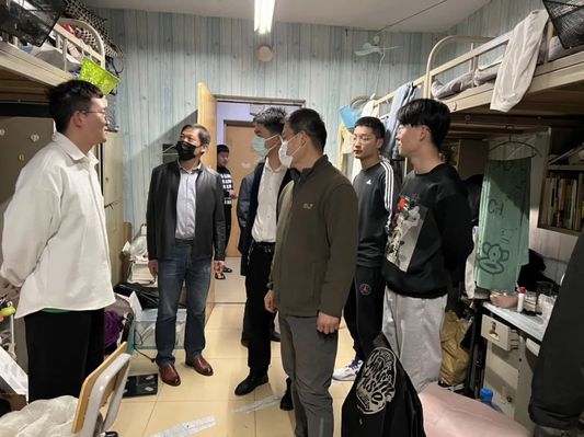 在走访过程中,王书记、台院长和学生亲切交流,询问同学们在学习及生活上遇到的困难,叮嘱学生们在特殊时期要提高疫情防控意识,严格遵守学院疫情防控相关要求,做好每日宿舍开窗通风、卫生清洁工作,加强体育锻炼,提高身体素质。王书记提到,校园封闭管理确实给学生日常生活带来了一定的影响,尤其是10号公寓位于校外,活动范围比较小,用餐也多有不便,需要克服更多的困难,同学们要服从防疫大局,筑牢疫情防控防线,这也是作为师哥师姐为学弟学妹们做好榜样。