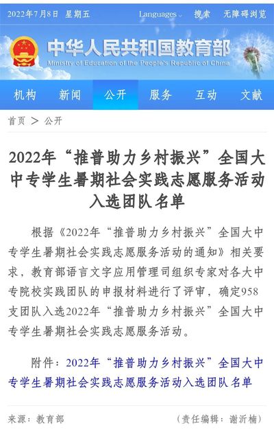 近日2022年“推普助力乡村振兴”全国大中专学生暑期社会实践志愿服务活动入选团队名单公布,晨曦志愿者服务队榜上有名,成为全国958支入选团队之一。