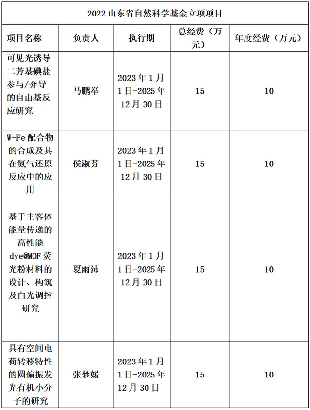 2022年度山东省自然科学基金青年、面上、优青、杰青项目评审和推荐立项工作已全部完成,我院马鹏举老师的“可见光诱导二芳基碘盐参与/介导的自由基反应研究”、侯淑芬老师的“W-Fe配合物的合成及其在氮气还原反应中的应用”、夏雨沛老师的“基于主客体能量传递的高性能dye@MOF荧光粉材料的设计、构筑及白光调控研究”、张梦媛老师的“具有空间电荷转移特性的圆偏振发光有机小分子的研究”项目成功立项。