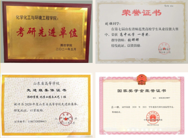 近5年在全国化工设计大赛、全国大学生化工实验大赛、全国大学生市政环境类创新实践能力大赛、山东省环境类专业大学生科技竞赛、山东省大学生化工过程实验技能竞赛、山东省师范类大学生从业技能大赛、山东省大学生化学实验技能竞赛、山东省大学生科技创新大赛等各级竞赛中累计获得一等奖18项、二等奖45项、三等奖60余项。2022年学院《刚柔并济,安“燃”无恙——锂电池安全的护航者》项目在第八届山东省“互联网+”大学生创新创业大赛中获高教主赛道省赛金奖,并获得国赛资格。实现了潍坊学院“互联网+”国赛资格的历史性突破!