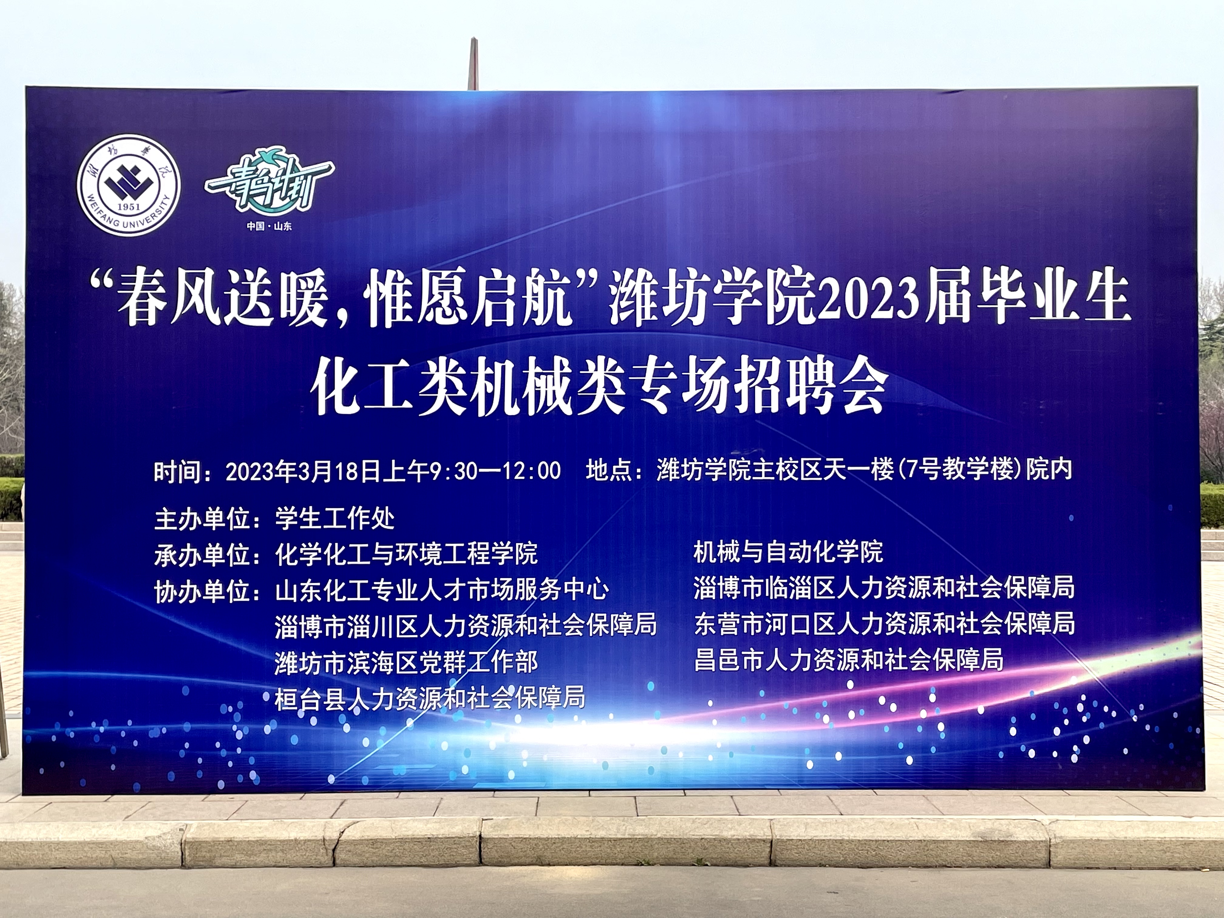 3月18日上午,作为学校2023年“春风送暖,惟愿启航”春季促就业线下双选会的第二场的化工类机械类专场招聘会在天一楼院内广场成功举办。本场招聘会由学生工作处主办,化学化工与环境工程学院和机械与自动化学院承办。从3月初开始我院主动对接山东化工专业人才市场服务中心、淄博市临淄区人力资源和社会保障局、淄博市淄川区人力资源和保障局、东营市河口区人力资源和社会保障局、潍坊市滨海区党群工作部、昌邑市人力资源和社会保障局,精心遴选优质企业,最终从100余家报名企业中选择裕龙石化、山东海化、齐翔腾达、东方钢管等64家用人单位入校参会,共提供化工、材料、制药、机械等相关工作岗位213个,招聘人数2000余人。