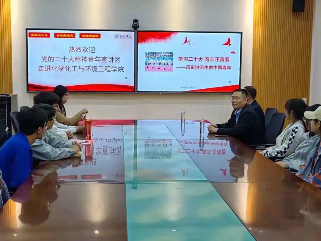 为深入学习宣传贯彻党的二十大精神,充分发挥党的助手和后备军作用,学校团委组建了二十大精神青年宣讲团,以青年学生易于接受的方式讲好讲透党的二十大精神。4月13日晚上团干部代表、物理与电子信息学院团总支书记金波昌老师,青年教师代表、马克思主义学院何建朋老师,学生骨干代表、政法学院耿怡娴同学,“青马工程”学员代表、音乐学院薛如钦同学,一行4人来到人合楼8213会议室为我院应用化学专业2021级1班团支部全体团员青年就党的二十大精神进行了一场内容丰富、深入浅出的精彩宣讲。