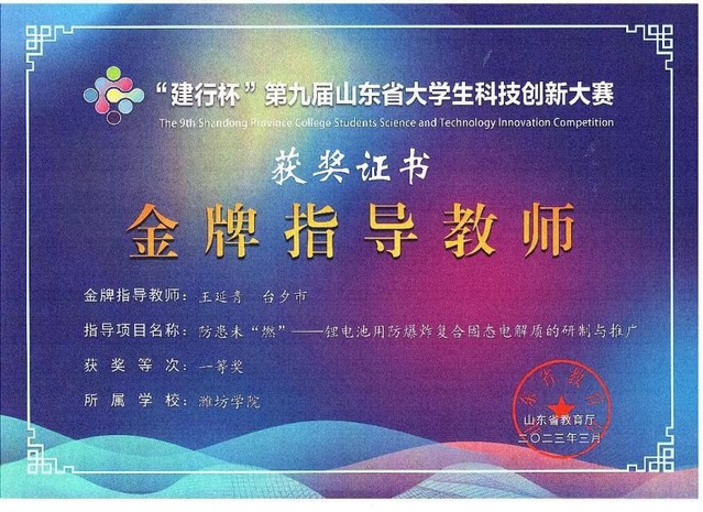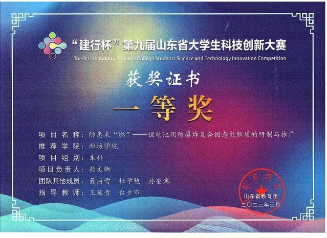 近日,由山东省教育厅主办的“建行杯”第九届山东省大学生科技创新大赛决赛,在山东农业大学落下帷幕。全省近70所本科高校共同竞争本科组的45个一等奖,经过激烈角逐,我院项目“防患未‘燃’——锂电池用防爆炸复合固态电解质的研制与推广”(项目负责人颜文卿)荣获一等奖,项目指导教师王延青、台夕市荣获金牌指导教师称号。