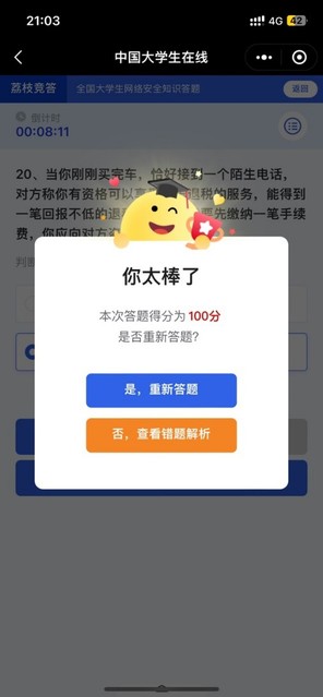 9月11日开始,学院按照学生处要求,组织全体学生积极参与“守护青春 网络有你”全国大学生网络安全知识答题活动,通过线上答题方式普及网络安全知识,提高大学生防范网络诈骗、安全使用网络的能力。学生参与度达100%。此外,学院开展大学生网络素养能力提升大课堂活动,组织学生在中国大学生官网上进行线上学习,提升大学生安全用网、善于用网、文明上网能力素养。