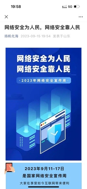 9月15日,学院微信公众号“扬帆化海”发布《网络安全为人民 网络安全靠人民》主题推文,努力营造网络安全文化氛围,开展教育引导,提升学生网络素养,文章点击度及转发度高,取得了良好反响。