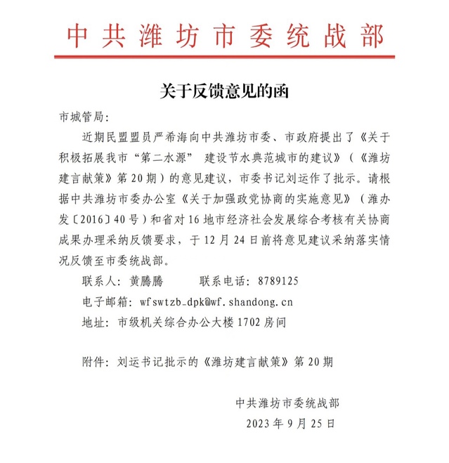 近日,我院严希海教授向中共潍坊市委、市政府提出了《关于积极拓展我市“第二水源”建设节水典范城市的建议》(《潍坊建言献策》第20期)的意见建议,市委书记刘运对此作出批示,要求相关部门采纳落实。