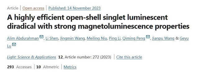 近日,我校教师申立博士与吉林大学电子科学与工程学院阿力木副教授、卢革宇教授团队、南京工业大学彭其明教授等研究人员合作,在国际学术期刊Light: Science & Applications上发表了题为“A Highly Efficient Open-shell Singlet Luminescent Diradical with Strong Magnetoluminescence Properties的文章,报道了一种具有高发光效率和稳定性的开壳单线态双自由基DR1。研究表明,DR1分子显示出很强的单分子磁致发光(ML)特性,在7 T的磁场下,实现了210%的极高ML值,显示出DR1分子在光电子和磁光学方面的巨大应用潜力。