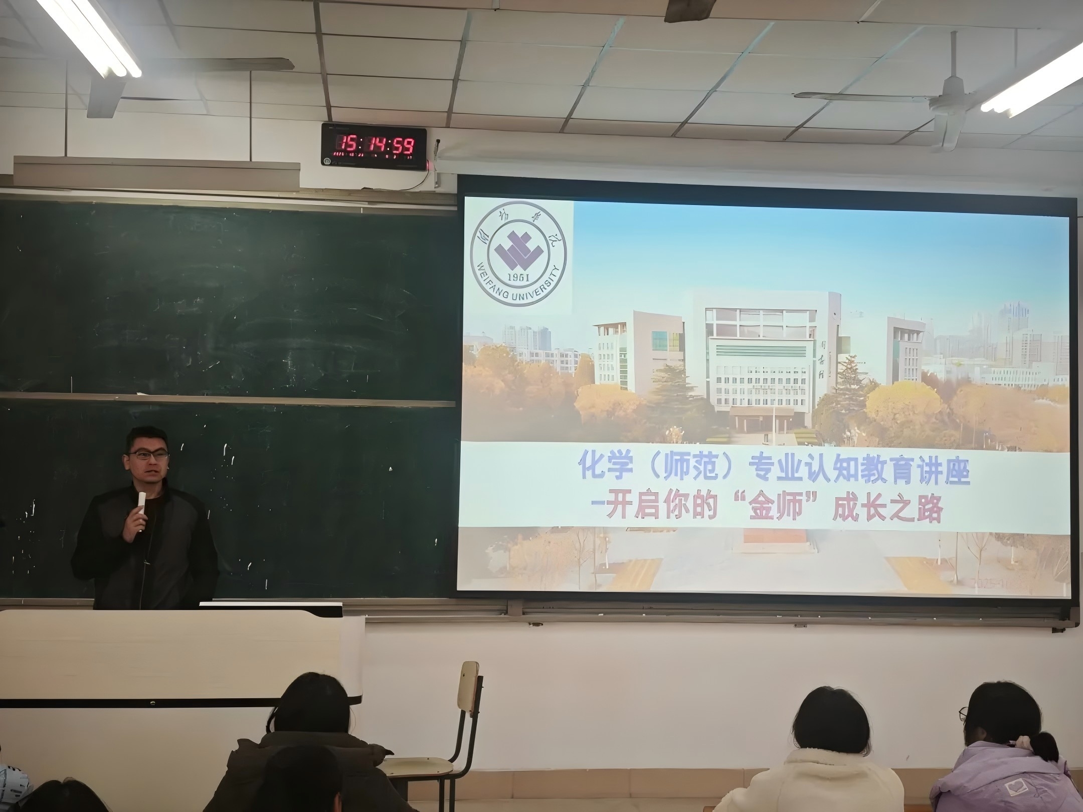 化学工程与工艺专业认知教育活动10月21日晚在8209教室举行,由郭焕美教授及化工系主任孔祥军博士主讲,两位教师聚焦“专业发展导航”,梳理专业发展历程,解读“类别+模块+平台”课程结构与“2+1+1”分段式培养模式,展示校企合作与实践资源。制药工程专业认知教育活动10月22日下午在8201教室开展,由制药工程系主任曹淑华副教授及隋秉霖博士讲授,他们围绕“学什么、干什么、怎么干”,解析核心课程体系与医药研发、生产管理等就业方向,以考研率超50%、就业率95%以上的数据向同学们展现专业优势。化学专业认知教育活动10月23日下午在8212教室举行,化学系主任任仰副教授以“助力学子开启‘金师’成长之旅”为主题,围绕专业发展情况、课程设置、师资概况、就业考研以及学习规划五个关键方面展开讲解。环境工程专业认知教育活动10月24日晚在8201教室开展,环境工程系主任杨金美博士结合“双碳”目标与环保政策,梳理“基础理论+实践操作”脉络,介绍环境监测、工程力学等核心课目标,解读专业在水污染治理、大气净化等领域的任务,剖析就业路径并分享考研案例。