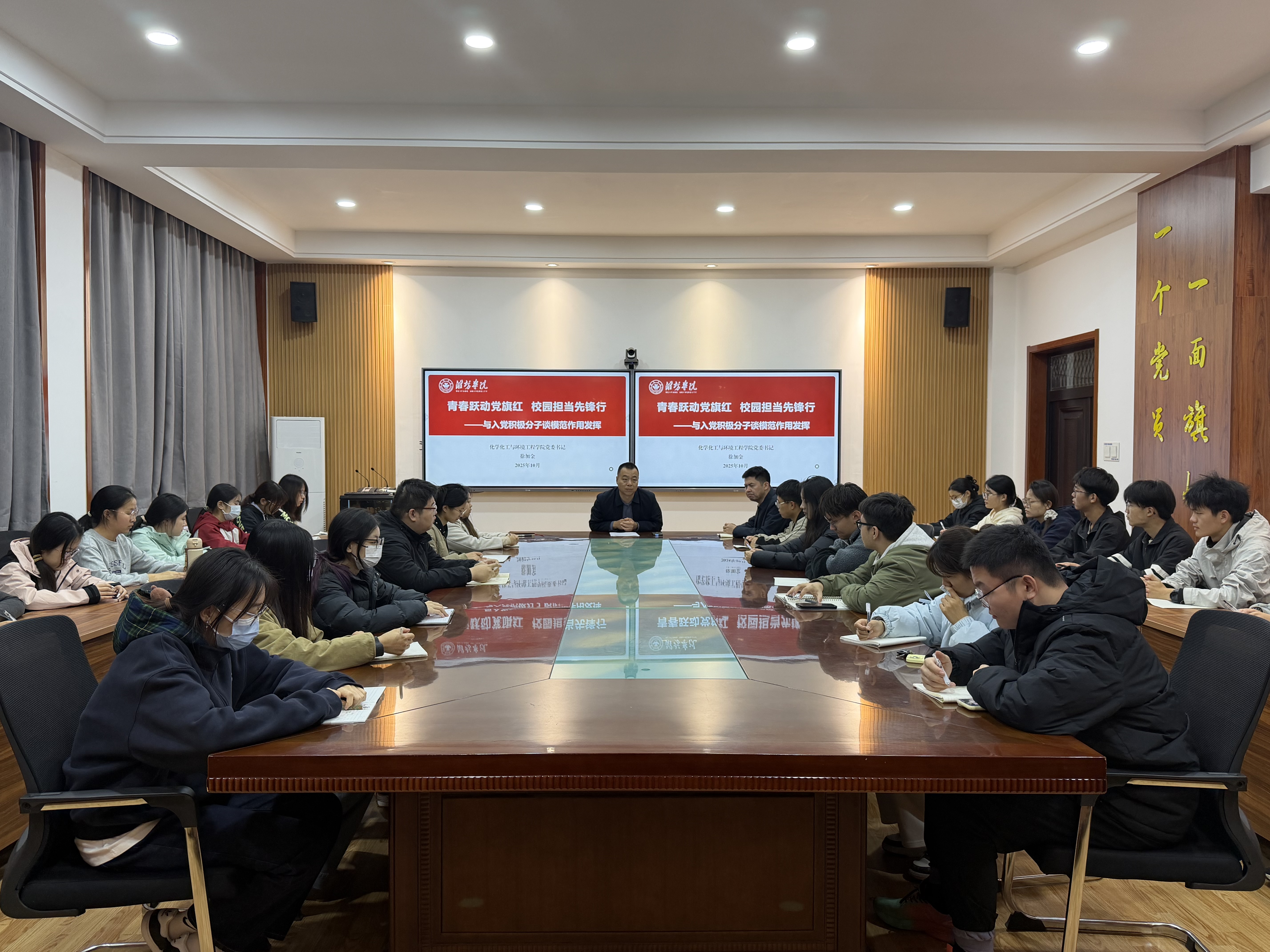10月29日,学院组织开展2025年度入党积极分子专题培训。学院党委书记徐加金以《青春跃动党旗红校园担当先锋行》为主题作专题党课辅导。学生工作办公室主任、学生党支部书记马永生主持会议,正科级辅导员、学生党支部委员韩靖雯及学院2025年下半年新发展的50余名入党积极分子参加培训。