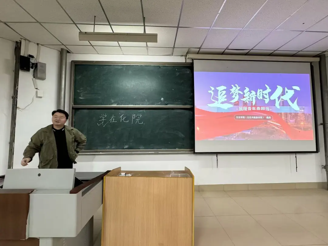 在时代成就回顾环节,文史学院辅导员魏涛老师聚焦国家发展的“硬核足迹”:从1986年“银河一号”超算让中国跻身世界超算强国开始,一张张承载着民族奋斗的图片,生动展现了“青年兴则国兴,青年强则国强”的深刻内涵。当看到中国从“站起来、富起来”到“强起来”的跨越,现场学子的家国自豪感愈发浓厚,更加清晰了自身作为新时代青年的责任分量。