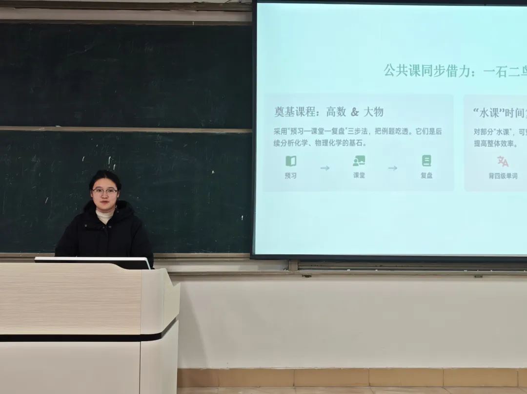 分享环节,七位优秀学长学姐结合自身经历,从不同维度为新生送上“成长干货”。2024级化学1班王晓悦聚焦专业课学习核心,以“预习—课堂—复盘”三步法为框架,细致讲解课前如何梳理知识框架、课上如何抓重点记笔记、课后如何高效复盘巩固,还分享了“边听边标疑难点”的高效听课技巧,为新生搭建起清晰的专业课学习路径。2023级化工春季1班刘浩则围绕“多维度成长”展开,从科研项目选题、学科竞赛备赛到社会实践参与,详细拆解“从萌生金点子到打磨出金奖方案”的进阶逻辑,鼓励新生主动探索学业之外的成长空间。