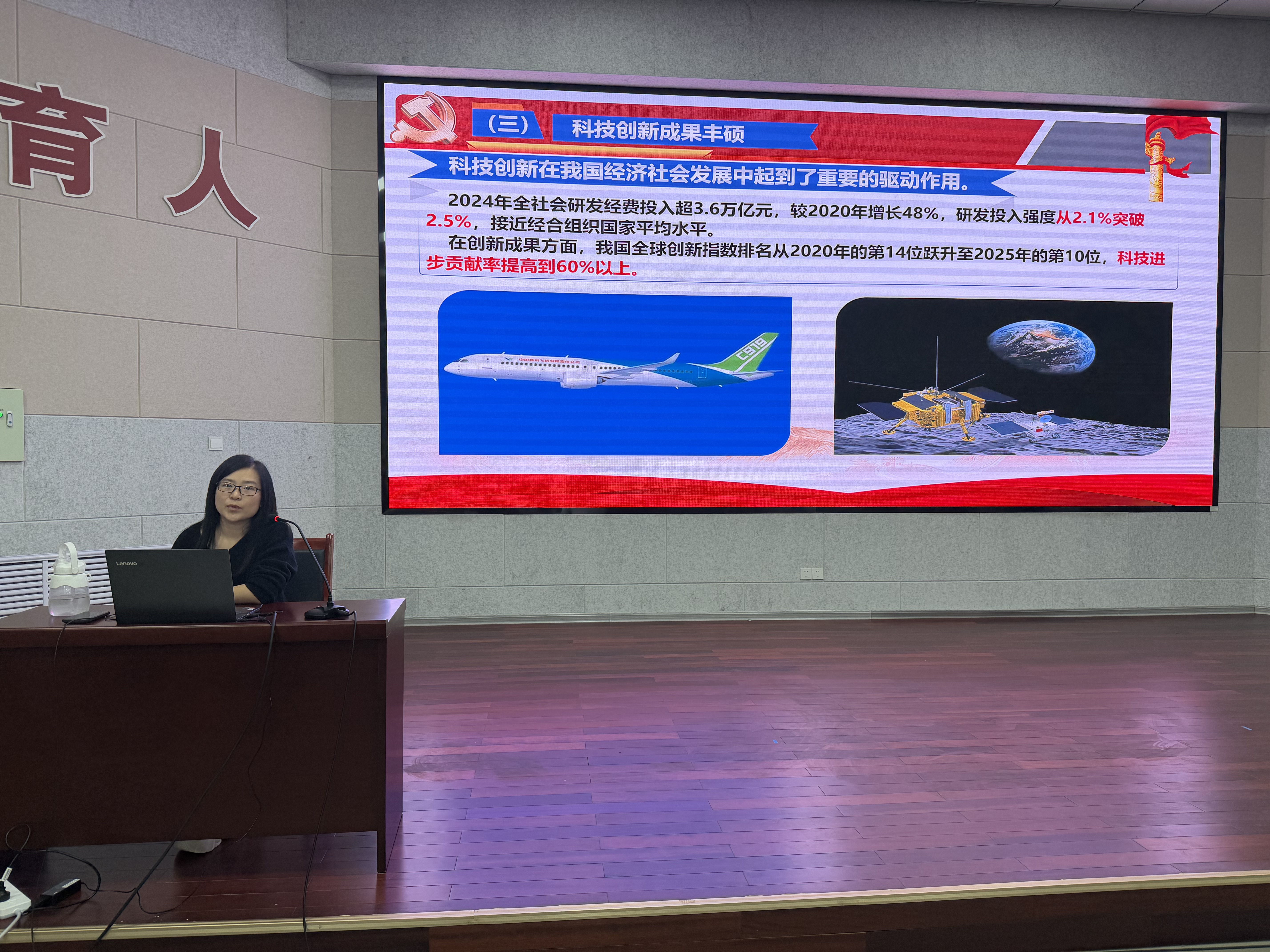 邹雷靖以“绘制新蓝图——党的二十届四中全会的战略擘画”为主题,从三个方面进行系统解读:一是全面回顾“十四五”时期取得的重大成就,通过国内生产总值突破121万亿元、如期完成脱贫攻坚、科技创新成果显著等具体数据,全面展示了我国在经济、科技、民生、生态等领域的发展成就;二是深入解读“十五五”时期现代化建设的战略部署,重点阐述了全会提出的“五个以”的指导思想、“六个坚持”的重大原则、“七个方面”的主要目标、“十二个方面”的战略任务和重大举措;三是聚焦高校实践使命,明确提出要以全会精神为引领,通过学深悟透筑牢思想根基、对标对表细化任务清单、以党建引领凝聚工作合力,推动全会精神在基层落地见效。宣讲报告主题鲜明、内涵深刻,具有重要的理论价值和实践指导意义。