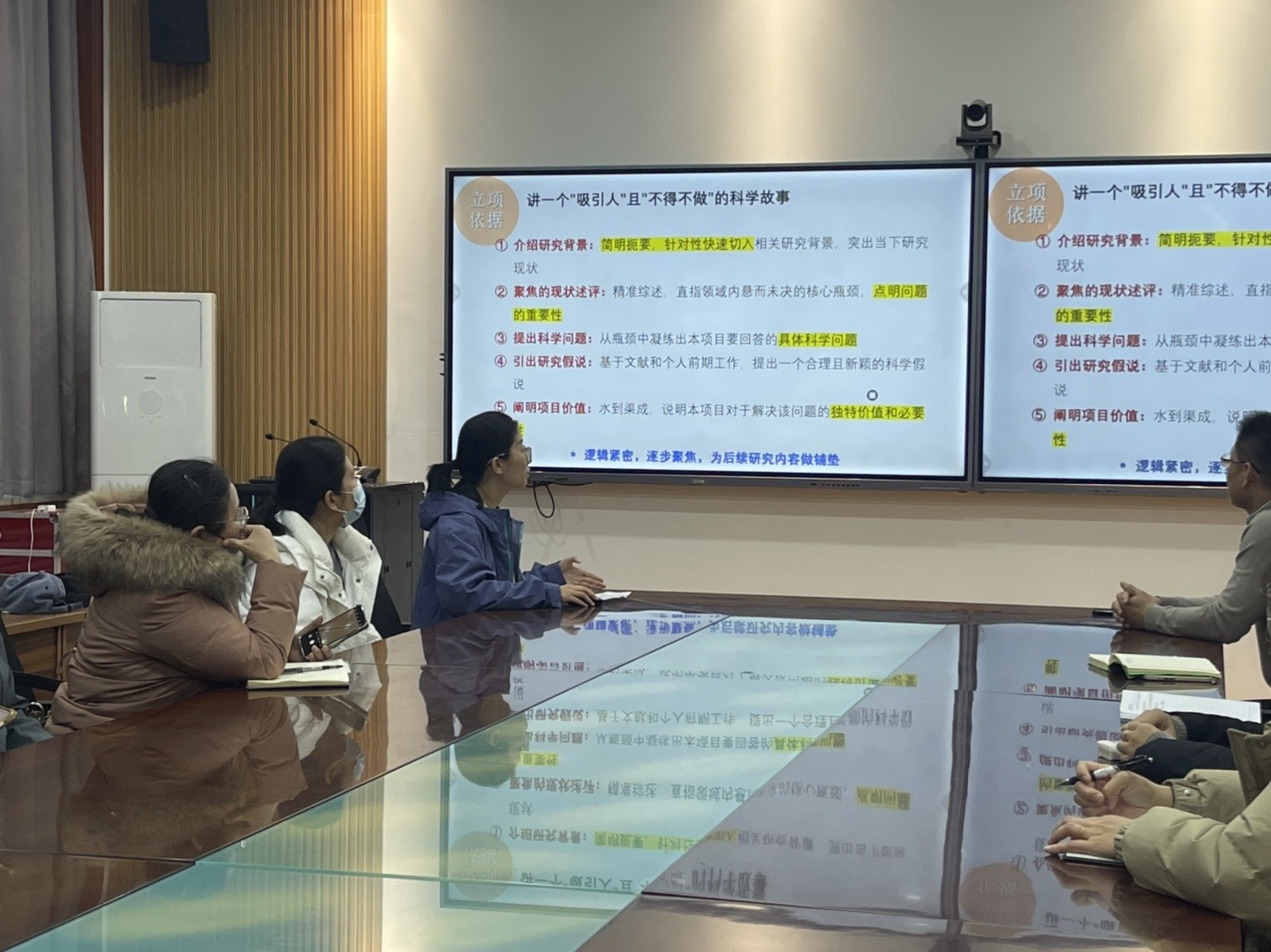 姜在勇结合八年申报实践,聚焦面上项目申报核心要点展开分享。他强调,选题需紧密对接国家战略需求,凸显科学问题的核心价值与学科适配性;研究内容要兼具学术深度与思路创新,预期成果须具备清晰显示度。在学术基础积累方面,他建议重点产出高质量代表性论文,优先引用第一作者文献,扎实筑牢研究根基,并特别指出,坚持不懈是项目成功获批的关键所在。袁之敏围绕“前沿、创新、突破、交叉”四大维度,系统阐述青年基金申报策略。她提出,课题设计需紧扣具体科学问题,重点保障解决路径的可行性与创新性。王玉以《讲一个“吸引人”且“不得不做的”科学故事》为题,分享申报书撰写技巧。她介绍,通过采用大量图示替代冗余文字、优化视觉呈现效果、突出核心研究优势等方式,可有效提升申报书的可读性与说服力。交流环节中,与会教师围绕申报书图表优化、互评互助机制搭建等具体议题展开深入研讨。