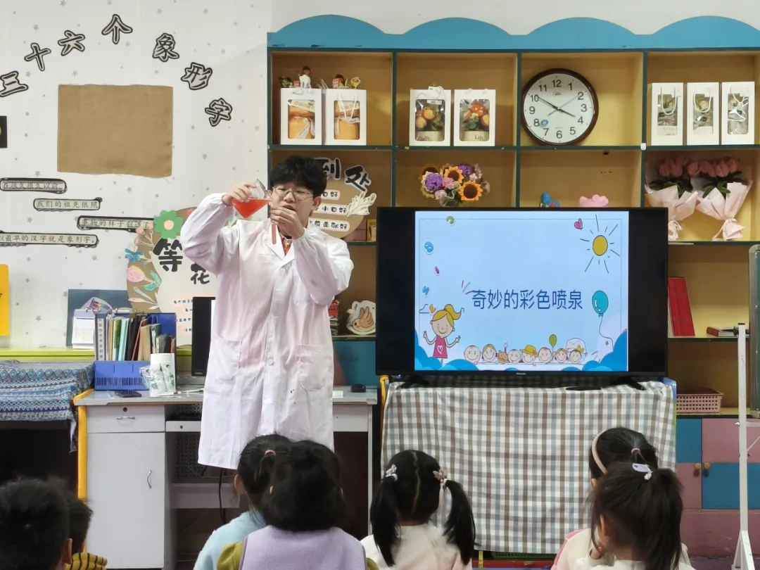 热身结束后,趣味喷泉实验正式拉开帷幕。志愿者提前备好透明容器、安全无害的小苏打、柠檬酸溶液以及红色素。实验前,他们向孩子们逐一展示实验材料,通过多感官引导让孩子们仔细观察,并详细介绍了各类材料的基础特性。当小苏打与柠檬酸溶液混合,滴入红色素的瞬间,细密的泡沫顺着导管喷涌而出,化作壮观的粉红色“喷泉”,孩子们瞬间被这奇妙的景象吸引,有的拍手欢呼,有的屏息凝神,专注地注视着翻涌的泡沫。志愿者们用生动形象的语言和手势,为孩子们揭秘了酸碱相遇产生气体的科学奥秘。同时,志愿者们根据游戏环节中对孩子们性格特点的了解,邀请不同孩子分批亲手添加实验原料,让每个孩子都能深度参与其中,充分体验化学实验操作的乐趣。