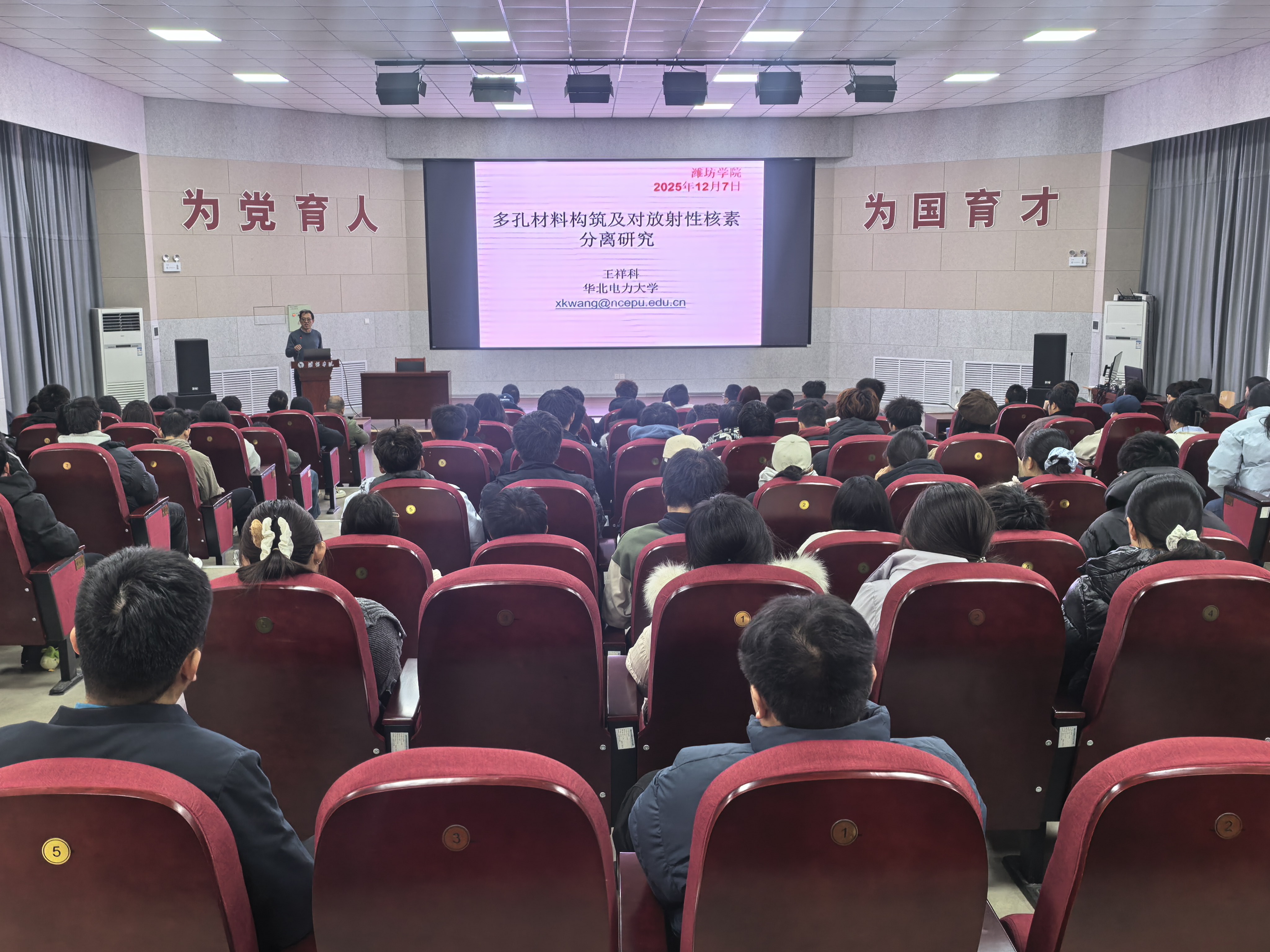 为助力青年教师和学生拓宽学术视野,锤炼创新思维,学院邀请教育部长江学者特聘教授、国家自然科学基金杰出青年基金获得者王祥科作学术报告。12月7日,在齐贤楼2109学术报告厅,王祥科以《多孔材料构筑及对放射性核素分离研究》为题为学院师生做了一场高水平的学术报告,学院100多名师生聆听了报告,报告由学院院长台夕市主持。